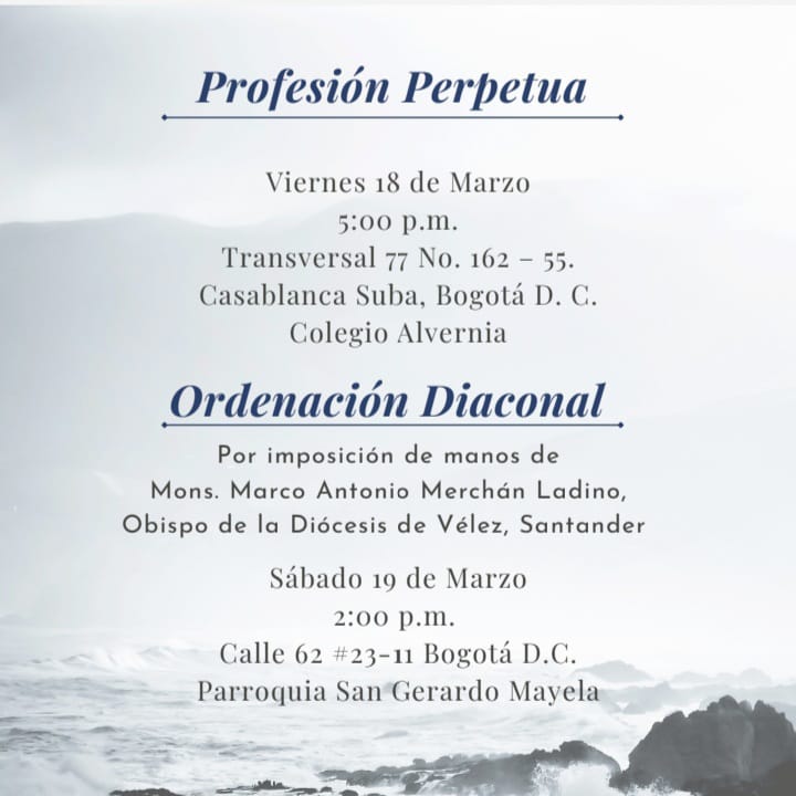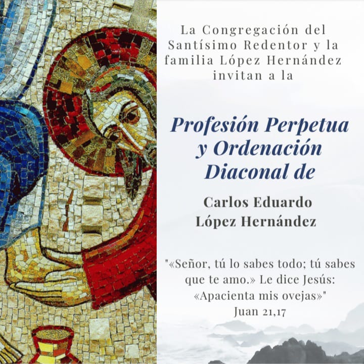 La Provincia Redentorista de Bogotá se alegra con la Profesión Perpetua y Ordenación Diaconal del joven misionero redentorista: Carlos Eduardo López Hernández. Ceremonias que se celebrarán el 18 y 19 de marzo del presente año. Carlos Eduardo recientemente realizó su segundo noviciado en Paraguay tras un proceso formativo de más de 9 años. A continuación la tarjeta de invitación: