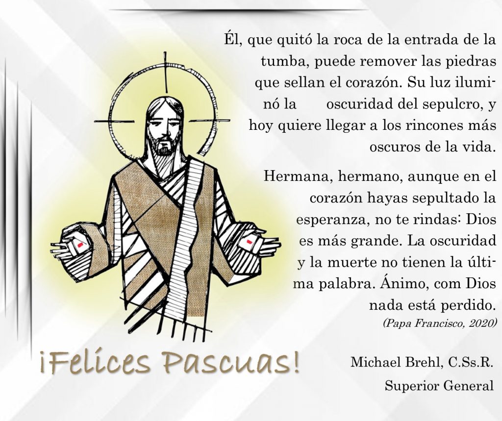 Hoy, al celebrar la Resurrección del Señor, me alegra enviaros estos saludos. Que la celebración de la victoria de Cristo sobre la muerte en estos días difíciles nos sumerja más plena y personalmente en el misterio de la Redención, para que, a través de esa caridad apostólica que unifica toda nuestra vida y nos identifica en cierto modo con Cristo Redentor, siga cumpliendo la voluntad de su Padre llevando a cabo la redención a través de nosotros (c. 52).